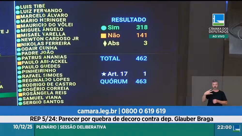 A vitória no plenário acontece após um episódio de forte impacto político. Na terça-feira (9), Glauber Braga foi retirado à força da cadeira da Presidência da Câmara por policiais legislativos, enquanto protestava contra a tentativa de cassação.